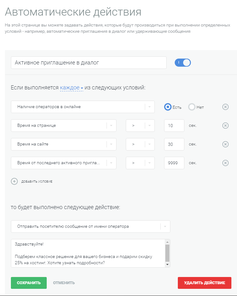 4. Время от последнего активного приглашения — практически бесконечность. Это означает, что если посетитель сознательно закрыл чат, приглашение к диалогу он больше не увидит.