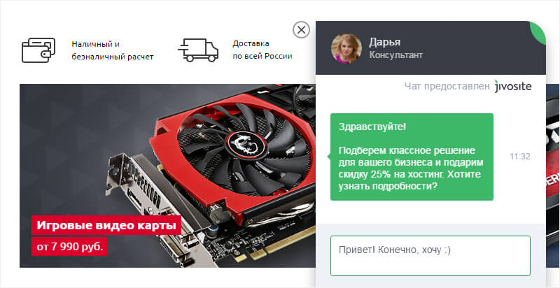 Как видите, настроить онлайн-чат просто: необходимо лишь представить себя на месте пользователя и понять, какое сообщение его может заинтересовать и принести пользу. Клиенты, для которых мы настраивали онлайн-консультант JivoSite, говорят, что на онлайн-чат приходится львиная доля продаж. А для одного из магазинов шин и дисков сервис стал основным каналом —настолько удачно удалось интегрировать его в бизнес-процессы.