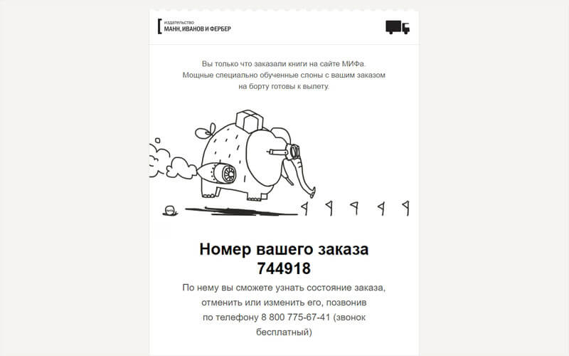 • Издательство «Манн, Иванов и Фербер» шлёт письма с летающими слонами, даёт возможность узнать о состоянии заказа, а в день заказа звонит и пишет СМС. А ещё у них мощное коммьюнити, отличные книжки и продуманный маркетинг, частью которого являются те самые слоны.
